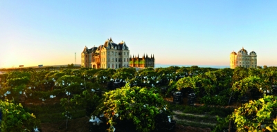 行走在葡萄小镇,异国风情的酒堡星罗棋布地掩映在山水美景中,“天蓝蓝,绿茵茵,葡萄架下果飘香”绘就了一幅与天地、大海相接的绿色画廊。