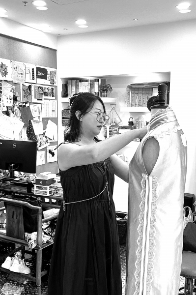 “我们的新中式服饰采用中古面料和非遗工艺,走小众轻奢路线,许多料子都是1950年左右的老缎,有的缎面集合抽纱绣、打籽绣等三四种工艺,制衣师傅更有着二三十年的制衣经验,每一件旗袍都是独一无二的。”在她的体验店内,客人可以身着新中式服装焚香、品茗、抚琴、对弈,全方位感受精神的充沛与内心的自由。
