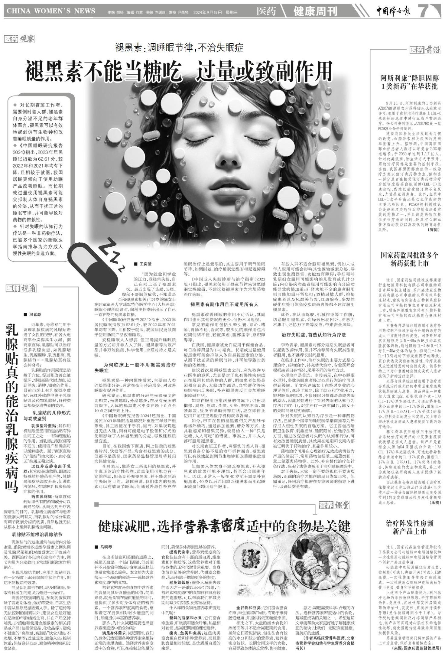 《中国成人失眠诊断与治疗指南(2023版)》指出,褪黑素仅用于昼夜节律失调型睡眠觉醒障碍,不建议将褪黑素作为常规药物治疗失眠。
