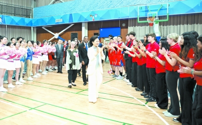 彭丽媛同中外嘉宾一道观看了中美青少年篮球友谊赛,并为双方队员颁发纪念奖牌。两国学生啦啦队表演了充满活力的健美操,赢得现场阵阵掌声。