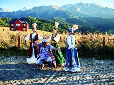 一万泉景区里,三十连职工为游客表演哈萨克民族舞蹈《黑走马》。董颖/摄