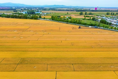 这是9月25日在黑龙江省集贤县拍摄的连片稻田(无人机照片)。    眼下,“北大仓”黑龙江省的黑土地上遍地金黄,玉米、大豆、水稻三大粮食作物均已进入成熟期,大面积秋收生产工作将于近日全面展开。黑龙江省农业农村厅农情调度显示,今年全省粮食生产面积增、结构优、长势好,粮食丰收已成定局。    新华社记者 谢剑飞/摄