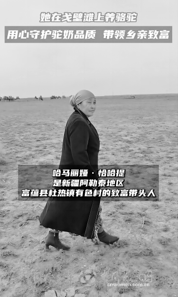 哈马丽娅·恰哈提是新疆维吾尔自治区阿勒泰地区富蕴县杜热镇有色村的致富带头人。自2006年开始,她创业养殖骆驼、售卖驼奶,用勤劳与智慧脱贫致富。她寻求家庭农场的转型升级,用心守护驼奶品质,从单一的家庭式生产发展成集养殖、加工、销售为一体的综合性驼奶产业。她将骆驼养殖技术倾囊相授,带动村民共同增收致富。她说,要让源自大自然的纯净馈赠完美抵达,让健康与爱随驼奶流淌进千家万户。