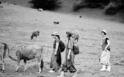 迎面是大片大片的草甸,黄的花、白的花、紫的花,三五头棕色牛儿悠闲地啃着草。我们的脚不自觉地就偏离了正道,狂奔进这绿野花海,感受高山草甸的绵软,拥抱大自然的美好。不知谁叫着:“我们来演个‘我们的阿勒泰’吧。”糖糖给我扎上土不啦叽的头巾,兔兔用胭脂给我的脸抹上了高原红,疏影戴上了李文秀一样的黑框眼镜,我们一会儿学张凤侠喝着大酒侃大天儿,一会儿拿起捡来的木棍赶牛羊,一会儿又在草甸上放声高歌……
