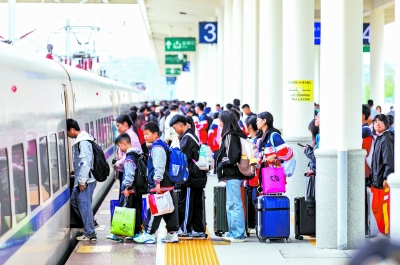 10月7日,乘客在贵州黔西站乘车。国庆假期最后一天,各地迎来返程高峰。 新华社发(范晖/摄)