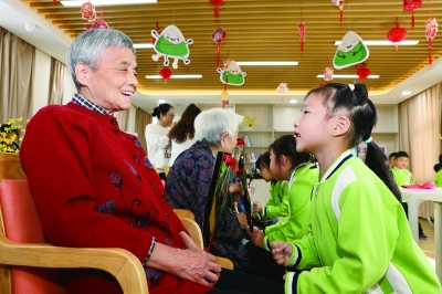 10月10日,在浙江省湖州市德清县武康街道群安社区示范型居家养老照料中心,远望幼儿园的小朋友为老人敲腿。 近日,各地举行丰富多彩的活动,倡导尊老、敬老、爱老的传统美德,喜迎重阳节。新华社发(倪立芳/摄)