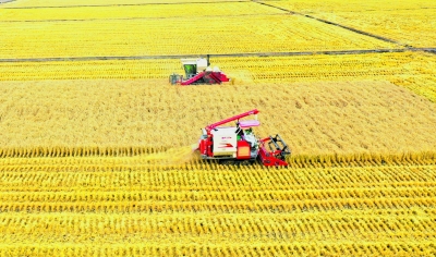 10月10日,农业机械在黑龙江北大荒农业股份有限公司友谊分公司第四管理区进行水稻收割作业(无人机照片)。 目前,中国产粮第一大省黑龙江进入秋收时间,开始大面积收获粮食作物。位于双鸭山市的黑龙江北大荒农业股份有限公司友谊分公司抢抓晴好天气,合理调配机具力量,掀起秋收高潮,确保粮食应收尽收、颗粒归仓。新华社记者 王松/摄