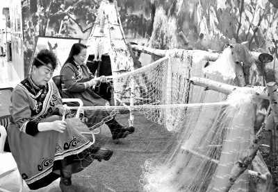 10月11日,在黑龙江省佳木斯同江市非物质文化遗产展示馆内,两位赫哲族妇女在为游客展示渔网编织技艺。黑龙江省佳木斯市是赫哲族的主要发祥地和聚居地,拥有多项非物质文化遗产。近年来,佳木斯在景区建设上加大文旅融合力度,以赫哲族博物馆、非物质文化遗产展示馆等作为推动文旅融合的重要依托,鼓励非遗从业者大力开发非遗文创产品。通过静态展示、活态传承、互动参与等形式让非遗“活”起来,有效提升了文旅影响力。新华社发(王颂/摄)