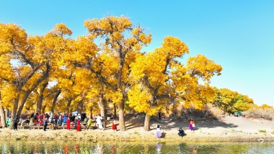 10月13日,游客在内蒙古阿拉善盟额济纳旗额济纳胡杨林旅游区游玩(无人机照片)。 近日,内蒙古阿拉善盟额济纳旗的胡杨林进入最佳观赏期,吸引众多游客前来观赏游玩。10月1日至10月12日额济纳旗总旅游人次超过136万,同比增长9.83%。 新华社记者
