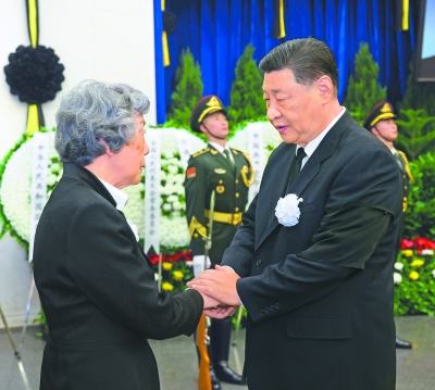 上午9时30分许,习近平、赵乐际、王沪宁、蔡奇、丁薛祥、李希、韩正等,在哀乐声中缓步来到吴邦国同志的遗体前肃立默哀,向吴邦国同志的遗体三鞠躬,并与吴邦国同志亲属一一握手,表示慰问。胡锦涛送花圈,对吴邦国同志逝世表示哀悼。