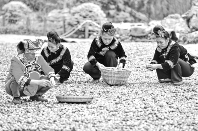 10月15日,村民在龙里县颐光山林油茶生态园晾晒油茶果。 近日,贵州省龙里县颐光山林油茶生态园种植的油茶果迎来收获季,种植户忙着采收、搬运、晾晒。 近年来,龙里县颐光山林油茶生态园结合山地气候环境,流转3000余亩荒山发展生态油茶种植,带动当地村民到油茶生态园务工,助农增收,促进乡村振兴。新华社记者 杨文斌/摄