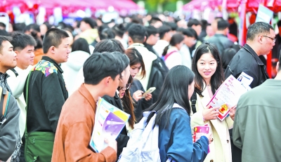 10月19日,在双选会上,大学生求职者在咨询相关岗位信息。    当日,河南高校毕业生就业市场豫西分市场暨河南科技大学2025届毕业生秋季双选会在河南洛阳举行。400余家用人企业提供了涵盖多行业领域的近两万个就业岗位,吸引了豫西地区十所高校的众多大学生求职者前来应聘。    新华社发(黄政伟/摄)