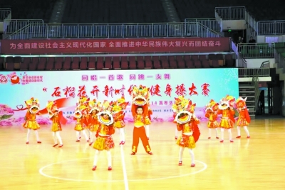 “我们和祖国母亲在一起,心连着心啊相偎又相依,蓝天的风筝牵着我和你,满满的幸福飞在春天里……”在新疆和田地区《石榴花开新时代》“一支歌一支舞”健身操展示比赛现场,参赛人员身着鲜艳服装,个个精神饱满、神采飞扬,用舞蹈展现积极奋斗、昂扬向上的精神面貌,表达对祖国的无限热爱。