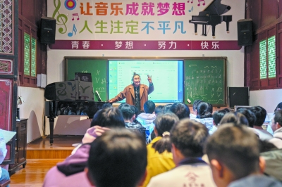 11月12日,在云南省会泽县第一中学,老师在给学生上音乐课。