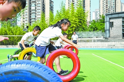 5月19日,重庆市渝中区天地人和街小学,同学们参加滚轮胎大课间活动。