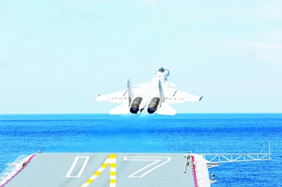 这是舰载战斗机滑越起飞。 新华社发(王健/摄)