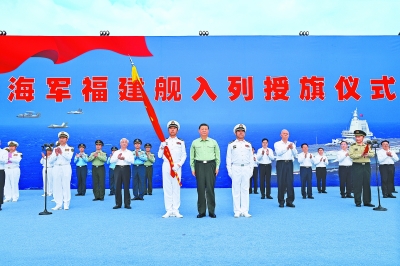 下午4时30分许,入列授旗仪式开始,全场高唱中华人民共和国国歌,五星红旗冉冉升起。仪仗礼兵护卫着八一军旗,正步行进到主席台前。习近平将八一军旗授予福建舰舰长、政治委员。福建舰舰长、政治委员向习近平敬礼,从习近平手中接过八一军旗。习近平同他们合影留念。入列授旗仪式在中国人民解放军军歌声中结束。