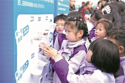 3月20日,小朋友在浙江宁波北仑区梅山湾沙滩公园举办的“水利科技集市”上体验净水过滤环节。