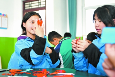 11月1日,在固原市隆德县杨河中学,学生在课堂上展示剪纸作业。 近年来,宁夏固原市隆德县在部分中小学开展非遗剪纸文化课,安排非遗传承人等为学生授课,培养学生的实践动手能力,让学生近距离体验剪纸艺术的魅力。 新华社记者 毛竹/摄