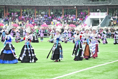 在融水苗族自治县民族体育公园举行的芦笙斗马节开幕式现场,当地群众在展示苗族服饰。 近年来,广西壮族自治区融水苗族自治县和广东省廉江市持续深化粤桂文旅协作,在产业发展、宣传推介、人文互动、游客互送等方面开展深度合作,推进民族文化旅游产业高质量发展,为乡村振兴注入动力。 新华社记者 黄孝邦/摄