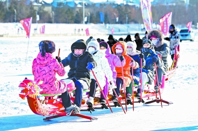 12月21日,人们在内蒙古呼伦贝尔的城市越野滑雪公园参加冰上龙舟比赛。冬日时节,人们在冰雪世界中享受这个季节特有的乐趣。