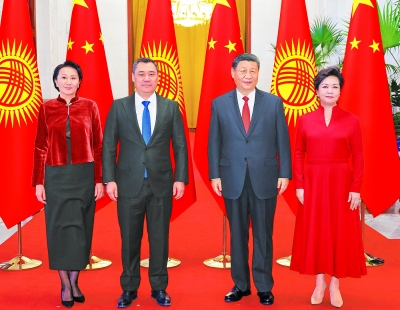2月5日上午,国家主席习近平在北京人民大会堂同来华进行国事访问的吉尔吉斯斯坦总统扎帕罗夫举行会谈。这是习近平和夫人彭丽媛同扎帕罗夫和夫人扎帕罗娃合影。 新华社记者 丁林/摄