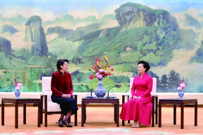 2月5日上午,国家主席习近平夫人彭丽媛在北京同吉尔吉斯斯坦总统夫人扎帕罗娃茶叙。 新华社记者 丁林/摄