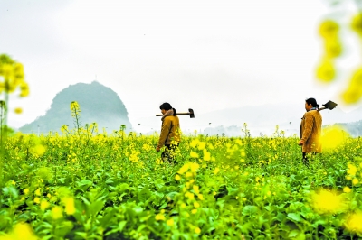 2月18日,在广西兴业县,两名村民扛着农具下田劳作。雨水时节,各地农民抢抓农时,积极进行春耕备耕。