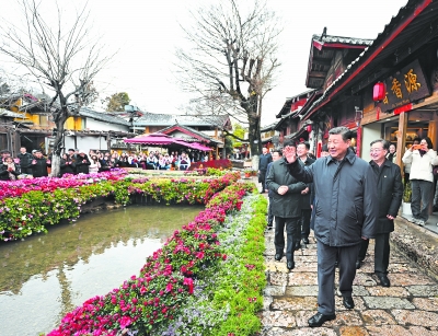 丽江古城有800多年历史,被列入世界文化遗产名录。一场春雪过后,丽江游人如织。习近平来到这里,详细了解古城营建历史、纳西族民居特色和当地文化遗产保护利用、推动文旅融合发展等情况。居民和游客见到总书记十分兴奋,争相问好,有的还弹奏乐器、载歌载舞欢迎总书记。习近平频频与大家互动交流,了解商铺经营状况和游客感受。他要求当地处理好保护和发展的关系,让这座美丽的古城焕发新的光彩。