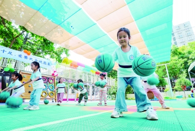 6月11日,河北省石家庄市桥西区滨江天禧府幼儿园的孩子们在新安装的彩色遮阳棚下做游戏。 近期,我国部分地区出现高温天气。人们采取多种方式降温消暑,感受清凉。 新华社发(张晓峰/摄)