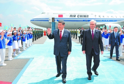 习近平抵达阿斯塔纳纳扎尔巴耶夫国际机场时,托卡耶夫总统率总统办公厅主任达杰拜、副总理兼外长努尔特列乌、总统外事顾问卡济汉、阿斯塔纳市长卡瑟姆别克等高级官员热情迎接。身着盛装的哈萨克斯坦女青年向习近平献花。礼兵分列蓝地毯两侧致敬,哈萨克斯坦少年儿童手持中哈两国国旗热烈欢迎习近平到访。习近平在托卡耶夫陪同下观看仪仗队分列式,直升机悬挂中哈国旗从机场上空飞过。在机场贵宾楼内,两国元首还共同欣赏哈萨克斯坦少年儿童的文艺表演。