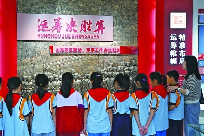 今年是抗日战争胜利80周年。近日,在山东日照碑廓镇山东军事会议旧址内,一名老师带着学生们参观,通过一张张相片,一段段故事,一个个实物,让爱国主义的种子在学生心里生根发芽。