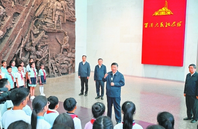 在纪念馆大厅,习近平同前来参观的青少年学生和纪念馆工作人员亲切交流。他说,88年前的今天发生的“七七事变”,是中华民族全面抗击日本侵略者的起点,前事不忘、后事之师,到这里来就是接受精神洗礼。广大青少年生逢其时,要赓续红色血脉,树立强国有我的远大志向,做堂堂正正、光荣自豪的中国人,勇担民族复兴的时代大任。