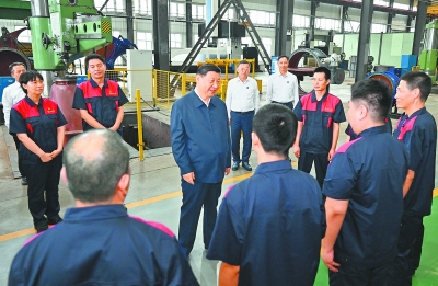7月7日至8日,中共中央总书记、国家主席、中央军委主席习近平在山西考察。这是7日下午,习近平在阳泉阀门股份有限公司考察时,同企业员工亲切交流。 新华社记者 燕雁/摄