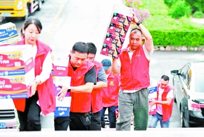 7月28日,志愿者在天津市蓟州区下营镇初级中学安置点搬运物资。