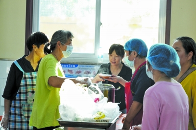 29日下午5点多,在安置点一层餐厅里,租住在附近的翟大姐与其他5位大姐正忙着分发自家做的热烙饼、玉米和绿豆汤。“我们都住在附近,乡里乡亲都是邻居,能帮就帮一把。”翟大姐笑着说,手里的活儿没停。
