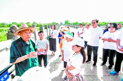 ▲ 郑福来在卢沟桥上宣讲抗战历史。