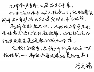 李思瑶希望,能以全球妇女峰会为契机,以法治力量严厉打击侵害妇女儿童权益犯罪,消除暴力与歧视,更多社会力量参与到未成年人保护特别是女童保护工作中,为全球孩子构建更安全更健康的成长环境。
