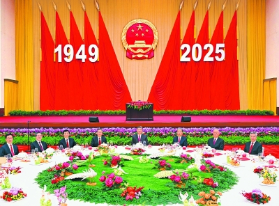 人民大会堂宴会厅华灯璀璨,洋溢着喜庆热烈的节日氛围。主席台上方高悬着庄严的国徽,“1949—2025”大字年号在鲜艳红旗映衬下格外醒目。