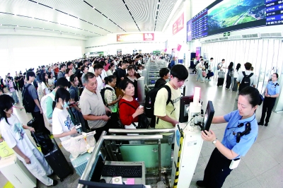 十月八日,旅客在江苏常州火车站检票进站。 国庆中秋假期最后一天,各地迎来返程高峰。 新华社发(陈暐/摄)