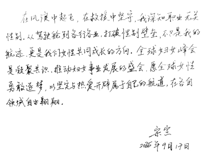 宋寅对即将召开的全球妇女峰会满怀热忱,她表示,“全球妇女峰会是凝聚共识、推动妇女事业发展的盛会,愿全球女性勇敢逐梦,以坚定与热爱开辟属于自己的航道,在各自领域自由翱翔。”