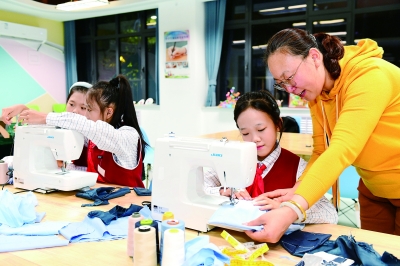 10月22日,在济南市历下区燕山小学,老师指导学生学习直线缝合技能。 今年9月,山东省济南市历下区燕山小学为进一步提升学生们的劳动素养和跨学科能力,在服装设计、环保时装秀等社团活动的基础上,与山东鸿天集团合作引入缝纫制作课,引导学生感受服装设计制作的乐趣。 新华社记者 郭绪雷/摄