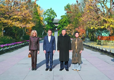 12月5日,国家主席习近平在四川省成都市都江堰同法国总统马克龙进行友好交流。这是习近平和夫人彭丽媛同马克龙夫妇合影。