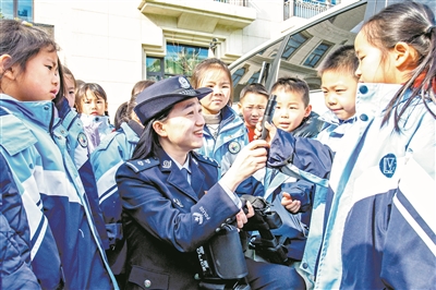 1月9日,在江苏省泰州市御园路幼儿园,泰州市公安局泰州医药高新区分局凤凰派出所民警给小朋友介绍警用装备。