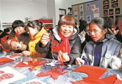 1月23日,在河南省洛阳市汝阳县“非遗贺新春·百马迎春”剪纸巡展活动中,龙乡剪纸协会非遗传承人向小学生传授剪纸技巧。