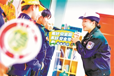 1月28日,天津市公安局滨海分局交通管理支队民警走进天津市海嘉学校,为学生讲授交通安全课,增强学生交通安全意识和自我防护能力。新华社发(杜鹏辉/摄)