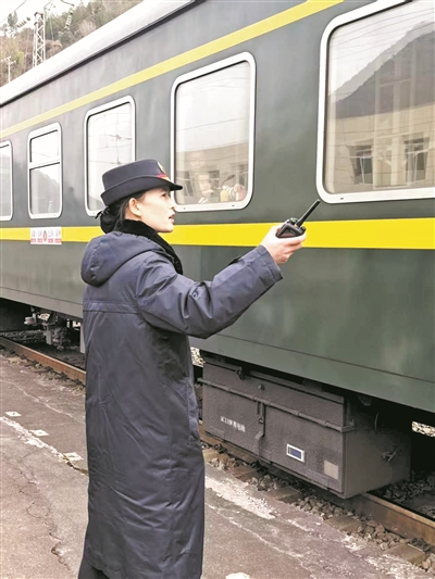 黄瑶正在列车旁指挥旅客上下车。高舒帆/摄