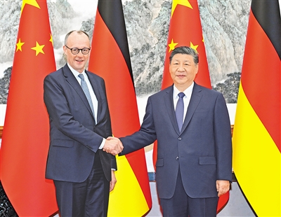 习近平强调,面对加速演进的世界百年变局,各国应该风雨同舟、命运与共。中德应坚持联合国的核心地位,重振联合国的主导作用,带头做多边主义的维护者、国际法治的践行者、自由贸易的捍卫者、团结协作的倡导者。中方支持欧洲自立自强,希望欧方同中方相向而行,坚持战略伙伴定位,坚持开放包容、合作共赢,实现中欧关系更大发展,为世界和平与发展作出更大贡献。默茨表示,很高兴在中国人民欢庆春节的时候来华访问,祝中国人民马年吉祥。德中建交以来保持着友好交往和密切合作,为两国人民带来福祉。德方珍视对华关系,坚定奉行一个中国政策,愿同中方一道,延续友好传统,坚持相互尊重、开放合作,不断深化两国全方位战略伙伴关系。德国企业界高度重视中国市场,希望进一步深化对华合作,实现互利互惠、共同发展。国际局势正在发生深刻变化,德中肩负着共同应对全球挑战的重要责任。德方期待同中方加强协调,坚持自由贸易,反对保护主义。欧盟同中国发展可靠和持久的经贸合作关系符合双方利益,也有利于世界稳定繁荣,德方支持欧中加强对话与合作。