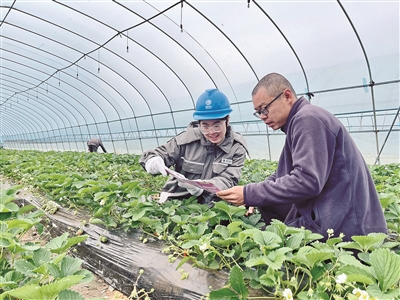 近日,国网温州供电公司巾帼服务队来到田间地头向农户宣贯安全用电知识以及电价政策,并义务检查农业生产线路设备,保障安全用电。图为巾帼服务队队员金芷忆在鳌江镇厚垟村草莓园对棚内用电设施开展安全检查,并向农户讲解安全用电知识。