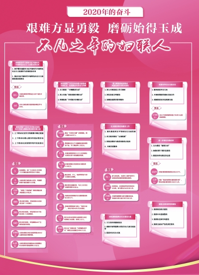 2020年是极不平凡的一年,是妇联工作在大战大考中砥砺奋进的一年。在以习近平同志为核心的党中央坚强领导下,各级妇联组织以习近平新时代中国特色社会主义思想为指导,紧紧围绕统筹疫情防控和经济社会发展、决胜全面小康决战脱贫攻坚等党中央重大决策部署,创新应急工作机制,抓实常态化工作举措,强化引领服务联系,凝聚坚定不移听党话、跟党走的强大巾帼力量,充分彰显了党有号召、妇联即行动的政治本色,用拼搏与奋斗交出了一份满意的答卷。